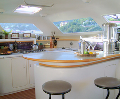 The brilliance of the Voyage 500 yacht design is in all the small details. This catamaran yacht sports a wide beam and offers outstanding stability and exceptional space in the staterooms, saloon, cockpit and deck. The beautiful gourmet upper level galley shares its large panoramic view windows with the saloon and bar that form an exceptional entertainment area. Each of the four double cabins with en suite bathroom and shower offer complete privacy for up to 8 guests. One of the most striking features on these yachts is the clean, modern interior and exterior design. The innovative design of this yacht will impress you from the moment you set foot aboard.