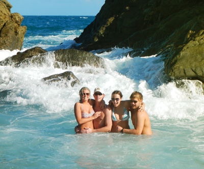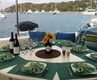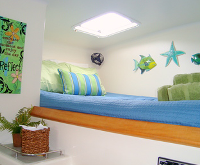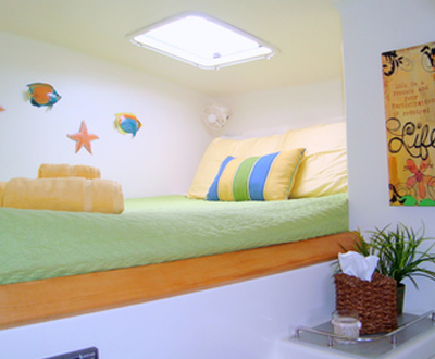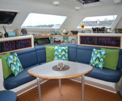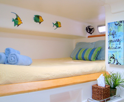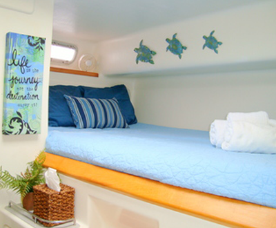 Four beautifully appointed, spacious staterooms with queen size beds. Each cabin features its own private en suite bathroom with electric toilets, shower, sink, and vanity cabinet with mirror. Each cabin is fitted with individual A/C controls, 110V power outlet, a CD player/auxiliary plug w/speakers, two reading lights, two cabin fans and ample locker space and storage.